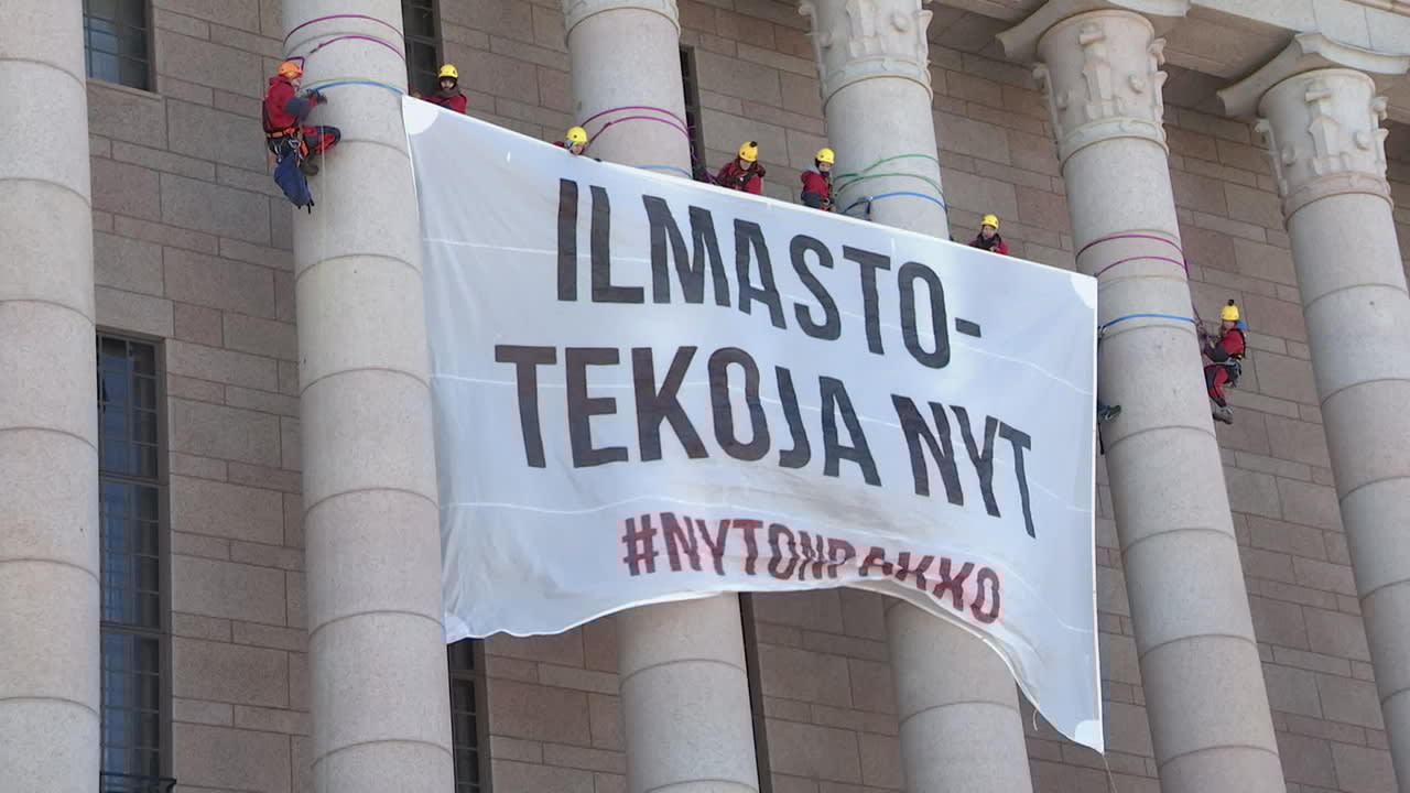 Helsingin keskustassa protestoitiin keskiviikkona päivällä ilmastomielenosoituksessa eduskuntatalon edessä. Osa mielenosoittajista kiipesi eduskuntatalon pylväisiin.